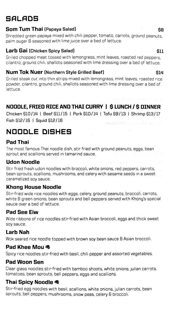 Introducing the menu at Khong Thai Cuisine in Rochester, NY promises a culinary adventure through traditional Thai flavors with a modern twist. From appetizers like crispy Crab Rangoons and flavorful Curry Puffs to fresh salads like Kung Salat and Larb Gai, each dish showcases the richness of Thai cuisine. The soups, including Rice Noodle Soup and Tom Yum, are aromatic and comforting. Customers rave about the generous portion sizes and the quality of ingredients used in each dish. With a diverse menu offering vegan and vegetarian options, as well as catering services and happy hour specials, Khong Thai Cuisine caters to a wide range of preferences. The ambiance, friendly service, and outstanding food make this restaurant a must-visit for Thai food enthusiasts in the Rochester area. Visiting Khong Thai Cuisine is not just a dining experience; it's a journey into the heart of Thailand's culinary traditions.